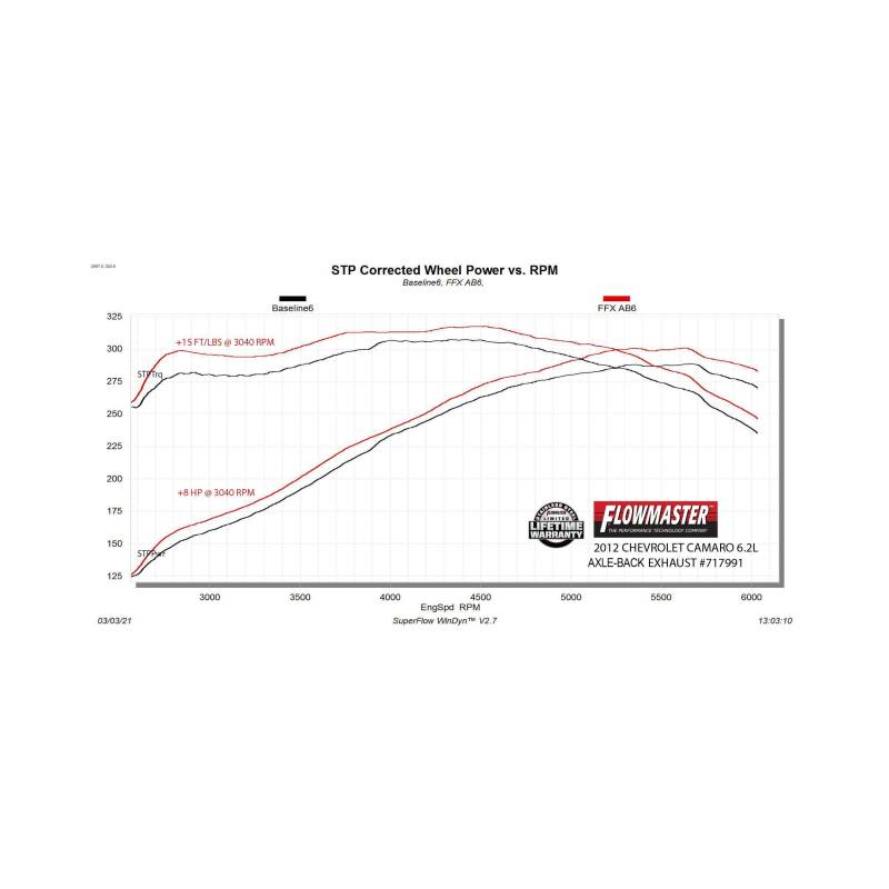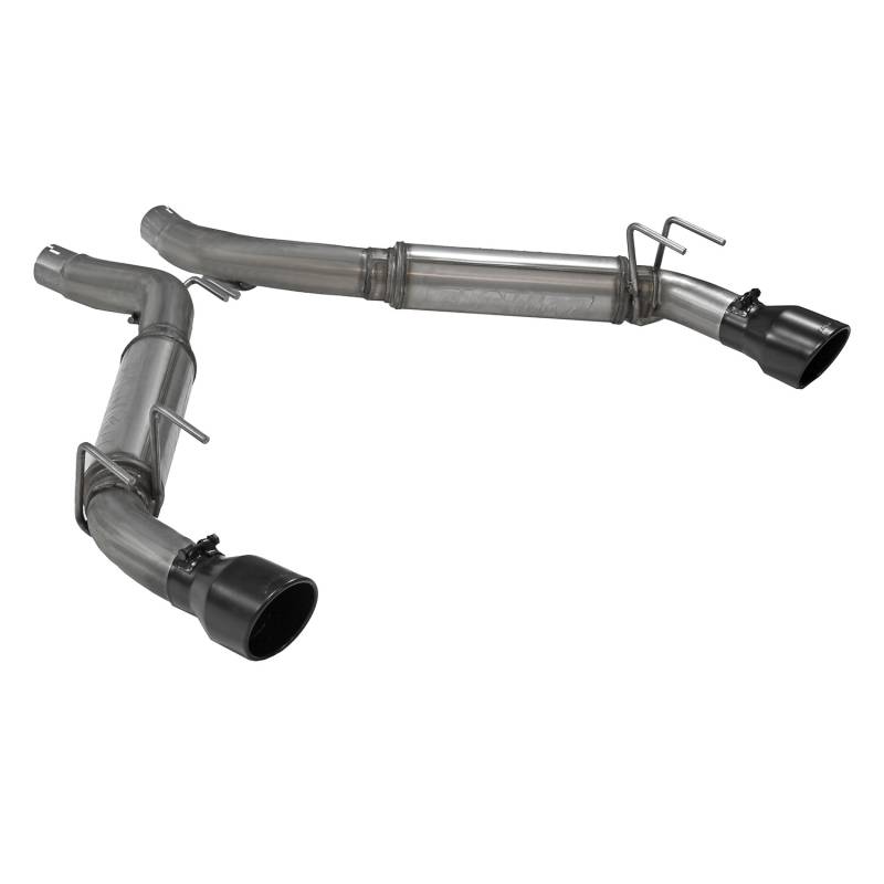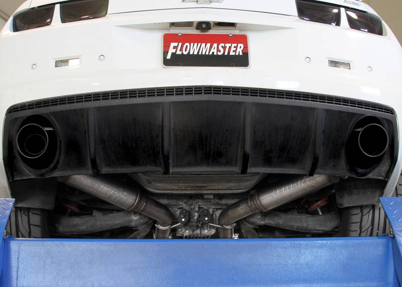 This new Flowmaster® Flow FX® axle-back exhaust system for the 2010-2015 Chevrolet Camaro with the 6.2-Liter engine is manufactured using durable 409 stainless steel throughout and features 3.00-inch mandrel bent pipes for better exhaust gas flow. Flow FX "straight-through" mufflers are used for an aggressive to moderate sound level and maximum performance. Maximum increases on the dyno revealed +8 hp and +15 lb.ft. at the rear wheels. This dual exit system has 4.50-inch black ceramic tips with the Flowmaster logo embossed in them for added style and a custom look. This system uses all the existing factory hanger locations and include installation instructions and all necessary hardware for an easy installation that you can do at home. Backed by Flowmaster's Lifetime Limited Warranty.
