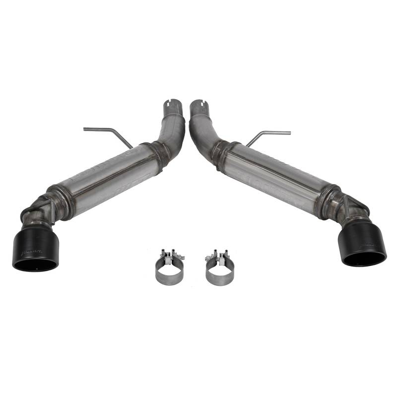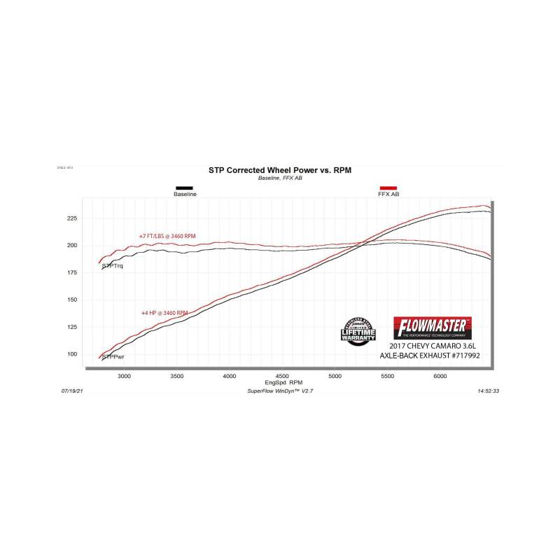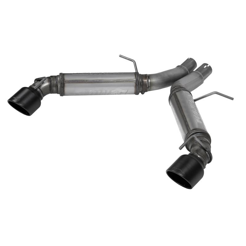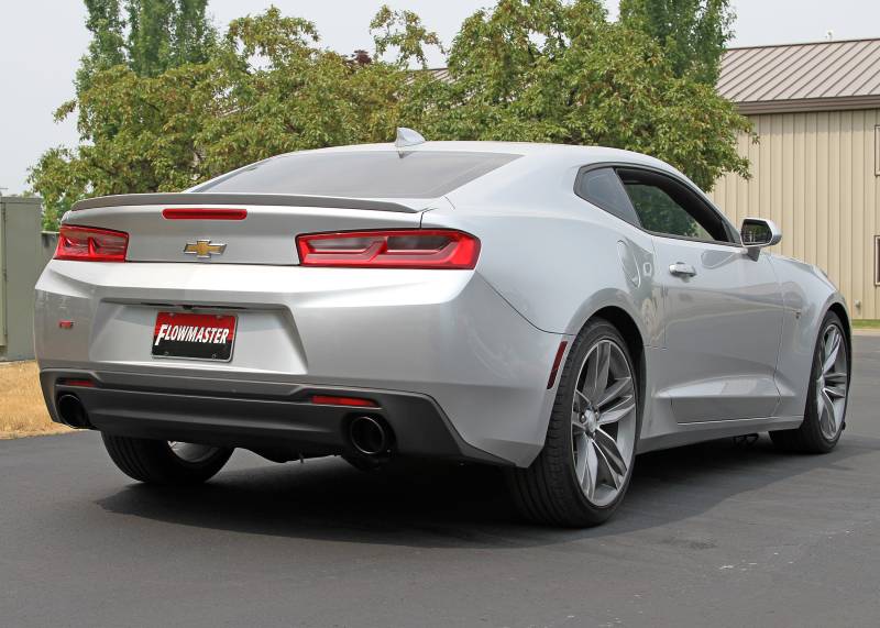 This new Flowmaster® Flow FX® axle-back exhaust system for the 2016-2024 Chevrolet Camaro with the 3.6-Liter engine is manufactured using durable 409 stainless steel throughout and features 3.00-inch mandrel bent pipes for better exhaust gas flow. Flow FX "straight-through" mufflers are used for an aggressive to moderate sound level and maximum performance. Maximum increases on the dyno revealed +4 hp and +7 lb-ft at the rear wheels. This dual exit system his 4.50-inch black ceramic tips with the Flowmaster logo embossed in them for added style and a custom look. This system uses all the existing factory hanger locations and include installation instructions and all necessary hardware for an easy installation that you can do at home. Backed by Flowmaster's Lifetime Limited Warranty.