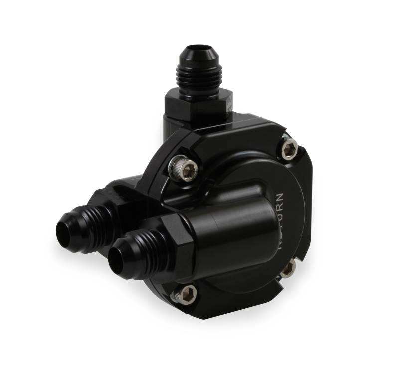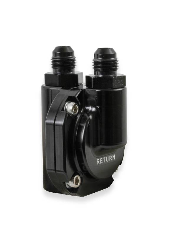 The billet EFI fuel pressure regulator is designed to be a space saving option when mounting on the end of the fuel rail or near the throttle body. The fuel pressure regulator is preset at 59.5 psi. The regulator cap can be removed and re-oriented to suit desired fuel routing. The billet 6061-T6 body has been machined for SAE6 ports and has three 6AN fittings and one extra plug included. An all black or black/clearcoat anodized finish is available.\nThese fuel pressure regulators are compatible with Holley Sniper or Sniper Stealth among other applications.\nRegulator is suitable up to 110 GPH pump flowrate. In terms of pump models that would be a 525lph pump or smaller.