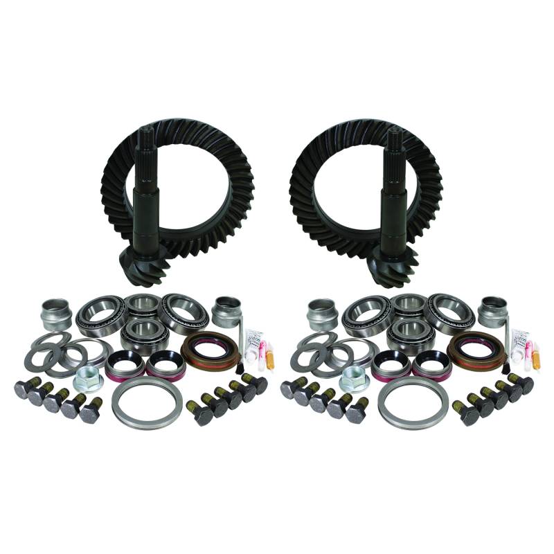 Yukon Gear & Install Kit package for Jeep TJ Rubicon, 4.56 ratio. Yukon Gear Kits combine all the parts you need for your re-gear project. It delivers front and rear ring and pinion gear sets and the proper Yukon Master Overhaul Kits in one single part number. Yukon Gear & Axle high-performance ring and pinion gear sets are the benchmark of quality in the automotive gear industry. Yukon engineers use state-of-the art design, advanced heat-treating techniques, and leading-edge quality testing processes to ensure the structure and surface finish meet exacting specifications and quality standards. Yukon offers its Y.E.S. Plan, a lifetime, comprehensive, no-questions-asked protection plan covering your gear set kit for as long as you own your vehicle. If you are thinking about increasing tire size, looking for more towing power, enhancing off-road prowess, or just replacing worn gears, these convenient combo kits have everything your vehicle will need. Fits Jeep TJ Rubicon 4.56 ratio Includes front and rear ring & pinion sets and master overhaul kits