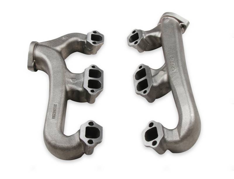 Hooker's new cast iron small-block Chevy exhaust manifolds offer an increase in performance and visual appearance over stock-style manifolds. Their compact design fit into a wide variety of replacement and engine swap applications. This means you get the traditional look and easy fitment of a stock style exhaust manifold but now with a smoother, cleaner appearance, plus more modern features. These manifolds are cast out of high silicon-molybdenum ductile iron for high temperature strength and better resistance to oxidation and cracking. Internally these manifolds have a larger than stock 1 5/8-inch cross-sectional area and 2 1/2-inch outlets for better air flow and improved performance. Designed for raised D-port heads, these manifolds fit many popular GM applications including standard straight and Vortec straight plug head designs. Finishes include natural, silver, black, and titanium ceramic. Gaskets and hardware are included, along with weld-on flanges to aid in downpipe installation.