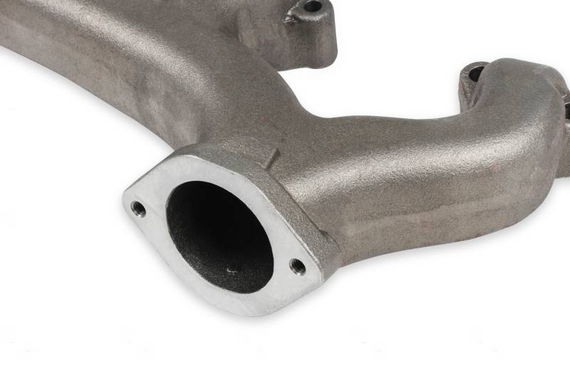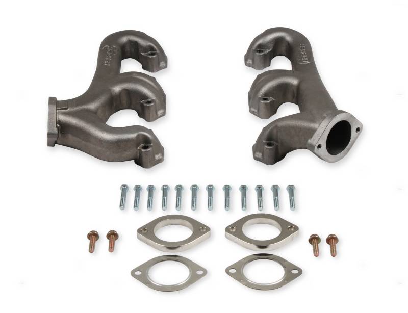 Hooker's new cast iron small-block Chevy exhaust manifolds offer an increase in performance and visual appearance over stock-style manifolds. Their compact design fit into a wide variety of replacement and engine swap applications. This means you get the traditional look and easy fitment of a stock style exhaust manifold but now with a smoother, cleaner appearance, plus more modern features. These manifolds are cast out of high silicon-molybdenum ductile iron for high temperature strength and better resistance to oxidation and cracking. Internally these manifolds have a larger than stock 1 5/8-inch cross-sectional area and 2 1/2-inch outlets for better air flow and improved performance. Designed for raised D-port heads, these manifolds fit many popular GM applications including standard straight and Vortec straight plug head designs. Finishes include natural, silver, black, and titanium ceramic. Gaskets and hardware are included, along with weld-on flanges to aid in downpipe installation.