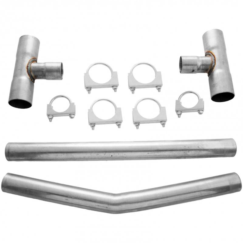 Designed to ease the installation of a crossover pipe in a dual exhaust system. Kit includes H-pipe connectors, balance pipe, and clamps. Available in various sizes.