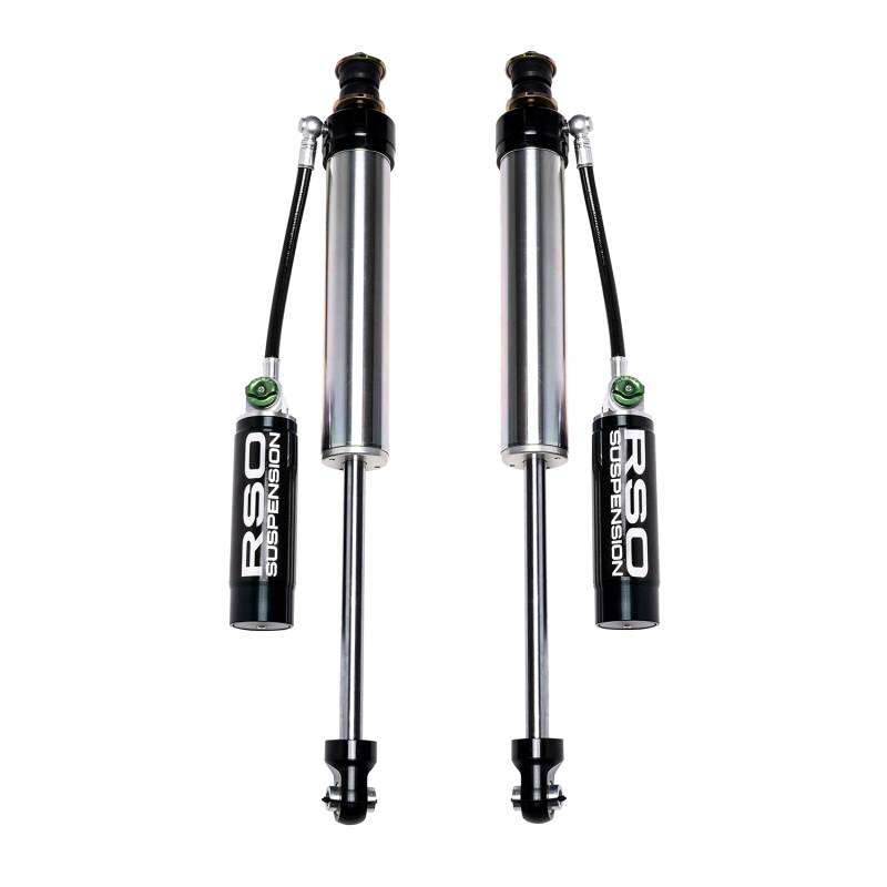 RSO Front 2.5 Adjustable Remote Reservoir Shocks 1-3in Lift for Wrangler JK/JKU RSO Suspension Adjustable Shocks with reservoir provide improved suspension damping while increasing on and offroad driving comfort. They feature hand adjustable compression levels to dial in and fine tune suspension feel. These 2.5in smooth bore machined alloy bodies give maximum corrosion resistance. The 3/4in steel shafts and heat-treated steel spherical bearings offer strength and dependability. Its external reservoir with high flow PTFE Lined Stainless steel braided tubing and hardened rubber UV coating hose allows for increased oil and nitrogen capacity giving greater heat dissipation, increasing performance, and eliminating shock fade. Experience for yourself the incredible performance and precise control that RSO Suspension’s new adjustable shocks deliver. Hand adjustable compression levels (soft or firm) for precise tuning Increased on and offroad comfort while increasing suspension travel and handling 2.5in steel body with polished 3/4in steel shafts and heat-treated spherical bearings offer strength and durability External remote reservoir with PTFE Lined Stainless steel braided tubing and hardened rubber UV coating hose allows for increased oil and nitrogen capacity reducing heat and shock fade. Race-developed high flow piston design Direct replacement for stock and aftermarket lift kits. Vehicle specific fitment to ensure that the part is right for your vehicle including vehicle specific reservoir mounts. Backed by a Limited 1 Year Manufacturer warranty