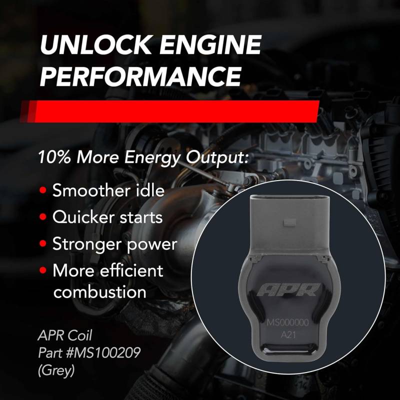 Refresh your ignition system in one shot with APR Ignition Coils and pair with APR Iridium Pro Spark Plugs engineered to work together for a stronger, more consistent spark. Each is a direct-fit upgrade designed to support smoother idle, sharper throttle response, and reliable performance under heat and load—whether you’re stock or running higher boost and power upgrades.\nUP TO 10% MORE ENERGY OUTPUT THAN STOCK: Unlock max engine efficiency with top of the line engineering. APR coils produce a more consistent spark which can mean increased engine power, improved throttle response, quicker acceleration, & smoother idling.\nDURABILITY MEETS ENGINEERING: No more sluggish acceleration or misfires. From premium materials to rigorous testing, each coil is engineered for consistency, durability, and more efficient power delivery–all packaged in a sleek, performance-grade casing.\nDIRECT PLUG AND PLAY: Just a few steps to your instant upgrade. Visually confirm 4-prong fit, then swap out existing OEM coils for plug and play ease.\nCOMPATIBILITY: APR MS100208 Coil (Red) fits a variety of Audi, Lamborghini, Porsche and VW vehicles - VW Group PQ35 / PQ45 platforms. Always confirm visually before installation to ensure proper fit.\nCHECK YOUR MAKE AND MODEL: Audi A3 A4 A5 A6 A7 A8 Allroad Q3 Q5 Q7 R8 RS4 RS5 S4 S5 S6 S8 SQ5 TT TTRS & TTS. Lamborghini Gallardo Huracan & Aventador. Porsche Cayenne & Panamera. VW Arteon Atlas Beetle CC Eos Golf Golf R GTI Jetta Passat Tiguan & Touareg\nREPLACEMENT FOR STOCK OEM: Direct replacement for OEM stock part numbers 06D905115A/C/D/F/G/K, 06E905115A/B/C/D/E/F/G, 06F905115C/E/F, 06H905611, 06H905115/B, 06L905110B, 07K905715D/E/F/G.\nTRUSTED IN THE U.S. FOR OVER 25 YEARS: Founded in 1997, APR is Headquartered in Opelika, Alabama and has become a global leader in quality and reliable performance aftermarket products for Volkswagen, Audi, Porsche, and other vehicles.\nIncludes: One Ignition Coil (MS100209)