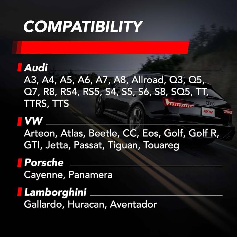 Refresh your ignition system in one shot with APR Ignition Coils and pair with APR Iridium Pro Spark Plugs engineered to work together for a stronger, more consistent spark. Each is a direct-fit upgrade designed to support smoother idle, sharper throttle response, and reliable performance under heat and load—whether you’re stock or running higher boost and power upgrades.\nUP TO 10% MORE ENERGY OUTPUT THAN STOCK: Unlock max engine efficiency with top of the line engineering. APR coils produce a more consistent spark which can mean increased engine power, improved throttle response, quicker acceleration, & smoother idling.\nDURABILITY MEETS ENGINEERING: No more sluggish acceleration or misfires. From premium materials to rigorous testing, each coil is engineered for consistency, durability, and more efficient power delivery–all packaged in a sleek, performance-grade casing.\nDIRECT PLUG AND PLAY: Just a few steps to your instant upgrade. Visually confirm 4-prong fit, then swap out existing OEM coils for plug and play ease.\nCOMPATIBILITY: APR MS100208 Coil (Red) fits a variety of Audi, Lamborghini, Porsche and VW vehicles - VW Group PQ35 / PQ45 platforms. Always confirm visually before installation to ensure proper fit.\nCHECK YOUR MAKE AND MODEL: Audi A3 A4 A5 A6 A7 A8 Allroad Q3 Q5 Q7 R8 RS4 RS5 S4 S5 S6 S8 SQ5 TT TTRS & TTS. Lamborghini Gallardo Huracan & Aventador. Porsche Cayenne & Panamera. VW Arteon Atlas Beetle CC Eos Golf Golf R GTI Jetta Passat Tiguan & Touareg\nREPLACEMENT FOR STOCK OEM: Direct replacement for OEM stock part numbers 06D905115A/C/D/F/G/K, 06E905115A/B/C/D/E/F/G, 06F905115C/E/F, 06H905611, 06H905115/B, 06L905110B, 07K905715D/E/F/G.\nTRUSTED IN THE U.S. FOR OVER 25 YEARS: Founded in 1997, APR is Headquartered in Opelika, Alabama and has become a global leader in quality and reliable performance aftermarket products for Volkswagen, Audi, Porsche, and other vehicles.\nIncludes: One Ignition Coil (MS100210)
