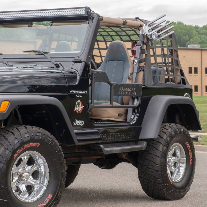 Jeep Wrangler TJ Aluminum Tube Doors ARIES Jeep tube doors are more than a fancy aftermarket toy for your Wrangler TJ; they are the key to turning your ride into the ultimate off-roading machine. Their open-concept design and aggressive cutout pattern makes them the perfect accessory for the desert baja and the rock climber alike. To keep your Jeep TJ light on its feet over every sand dune, ARIES Jeep tube doors are built to be lightweight while still maintaining superior strength. They are constructed from T6 aluminum alloy, making them strong but far lighter than steel. We also use 100% TIG welds to ensure a solid build and a precise fit on your vehicle. Jeep tube doors are quick to install and easy to remove whenever necessary, using the factory hinge points. They are coated in a durable black powder coat for maximum corrosion resistance (NOTE: Before purchasing ARIES Jeep tube doors, it is recommended that you check local and state laws. Some laws may prohibit the use of this product). Open design and aggressive cutout for ultimate offroad look and feel Hardened T6 aluminum construction to be strong, lightweight and rust-free Durable carbide black powder coat finish for maximum corrosion resistance 100% TIG welds for a precise fit Simple installation using existing hinge points