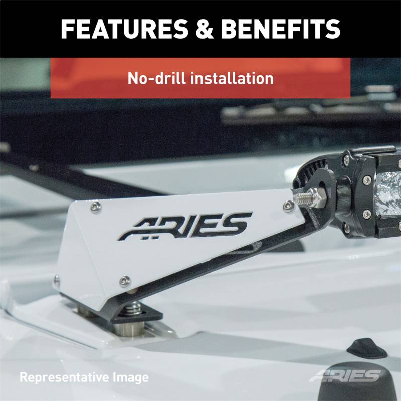 Jeep JK Hood Light and Brackets There is a sense of possibility unlike any other that comes every time you grip the wheel of your Wrangler JK and throw the transmission into drive. For shedding a little extra light on the trail and standing out from the rest of the herd, ARIES Jeep hood light mounting brackets are the accessory of choice. They mount quickly and easily on the hood of the Jeep Wrangler JK, using factory mounting points, and accept the included 20" single-row LED light bar #1501262. The light bar features grade-A LED chips, an IP68-standard breather and provides a 9,800-lumen combo beam pattern. Because the brackets use existing mounting locations, there is no drilling necessary, and they will not interfere with the factory windshield washer sprayers. To easily outlast rust and keep your Jeep JK looking like a pro, these LED light bar mounting brackets are made from stainless steel and are shielded in a carbide black powder coat finish. Grade-A LED chips offer 9,800-lumen, combo beam pattern Light features waterproof aluminum housing and IP68-standard breather Fitted with a strong, waterproof wiring harness for a reliable connection Will not interfere with factory windshield washer sprayers Formed stainless steel construction to be strong and rust-free