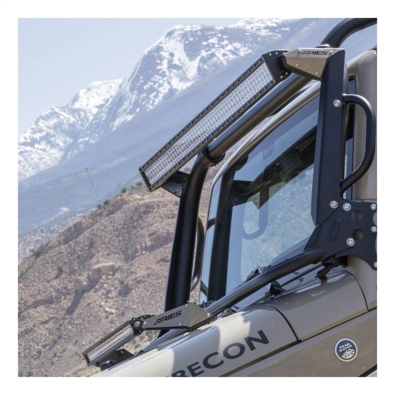 Jeep JK Hood Light Mounting Brackets There is a sense of possibility unlike any other that comes every time you grip the wheel of your Wrangler and throw the transmission into drive. For shedding a little extra light on the trail and standing out from the rest of the herd, ARIES Jeep hood light mounting brackets are the accessory of choice. They mount quickly and easily on the hood of the Jeep Wrangler JK, using factory mounting points, and accept an LED light bar up to 20" long (ARIES 20" single-row LED light bar #1501262 recommended). Because they use existing mounting locations, there is no drilling necessary, and the brackets will not interfere with the factory windshield washer sprayers. To easily outlast rust and keep your Jeep JK looking like a pro, these LED light bar mounting brackets are made from stainless steel and are shielded in a carbide black powder coat finish. Mounts a 20" LED light bar on the Jeep JK hood (#1501262 recommended) Will not interfere with factory windshield washer sprayers Formed stainless steel construction to be strong and rust-free Durable carbide black powder coat finish for maximum corrosion resistance Removable brushed stainless steel cover plates for added style