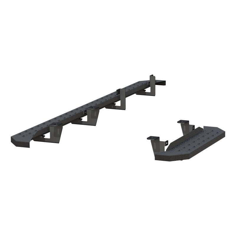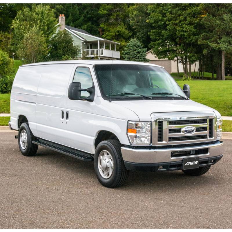 RidgeStep 6-1/2" x 96", 36" Black Steel Running Boards, Select Ford E-Series Powerful, definitive and uncompromising as a mountain ridge, ARIES RidgeStep running boards are made for those who gets it done, day after day. With their solid, all-steel construction, non-skid treads and tough powder coat finish, RidgeStep running boards are made to finish the job. Installation of these running boards is easy and secure because they use the ARIES VersaTrac mounting system. The underside of each board is equipped with a channel that accepts a set of heavy-duty bracket inserts. The inserts move along the channel to fit your cargo van, and the mounting hardware provides a secure attachment. These running boards are designed to fit specific years of the Ford E-150, E-150 Econoline, E-250, E-250 Econoline and E-350 Super Duty (NOTE: This set of running boards includes vehicle-specific VersaTrac mounting brackets. See the application information to verify compatibility with your vehicle). ARIES RidgeStep running boards are not only made for easier installation, but they are also built to face the harsh elements of the commercial job. They feature high-strength, solid steel construction for a step that can keep up with those steel-toe boots, and they are completely without plastic parts, meaning they will not crack or fade over time. Their stamped, all-steel tread offers a 6-1/2" wide, non-skid surface that will never wear down no matter how many times you climb in and out of your work van. The end caps are also made from steel and are welded to contour to the body of your van for a professional finish. RidgeStep running boards come with a unique E-coat and textured black powder coat finish to not only withstand rust but also to hide minor scratches and grime. High-strength, all-steel construction with no plastic parts Angular design for a tough, no-nonsense look on hardworking vehicles Stamped steel treads for a non-skid step that will never wear or crack Flat profile and 6-1/2" width provide a comfortable step Textured black powder coat easily hides minor scratches and grime