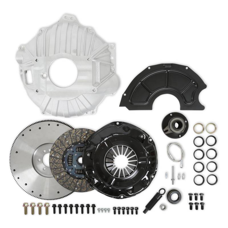 These Holley Transmission Installation Kits come complete with everything you need to bolt a TKX or TKO transmission to a 1970-1990 454 big-block Chevrolet engine. Built with a mixture of our best brands including Lakewood, Hays and Mr. Gasket. Kit includes: A roller pilot bearing, bellhousing with dust shield, billet steel flywheel, clutch and pressure plate, hydraulic release bearing, and all hardware needed to install these components.
