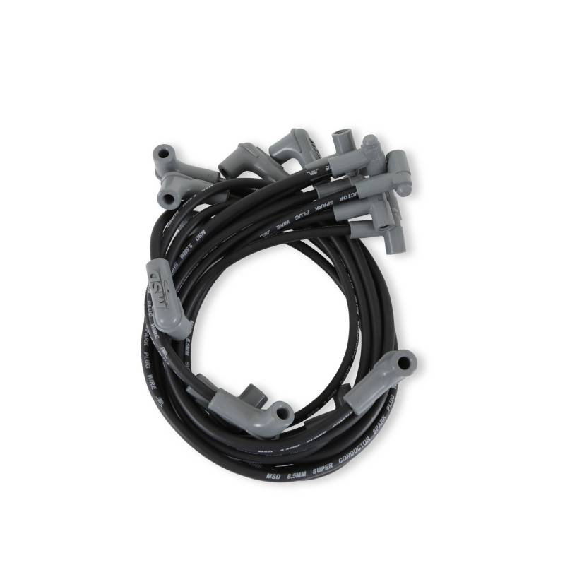 This combination is encased in a heavy duty sleeve that will withstand abrasion and high temperatures. Cap off each end with our Dual Crimp Terminals and you have the best wire available.\nThe MSD 8.5mm Super Conductor is the ultimate performance wire! Its extremely low-resistance combined with the ability to suppress Electro Magnetic Interference is a combination that defies the common laws of physics.\nLess resistance means more energy is going to make it to the spark plug to ignite the air/fuel mixture. The Super Conductor uses a copper alloy conductor resulting in less than 50 ohms per foot of wire! This ensures that the most energy possible makes it to the spark plug. By helically winding the conductor around a special core, we are able to produce a highly effective choke to keep the EMI inside the wire and away from other electronics.