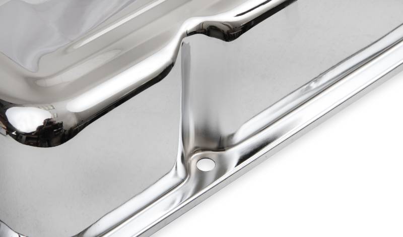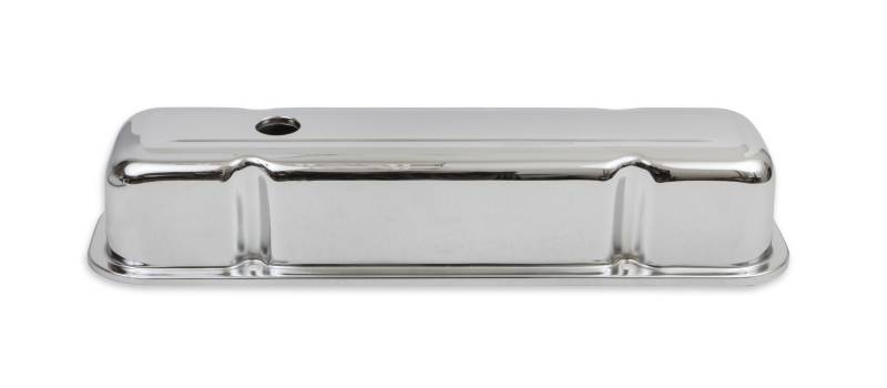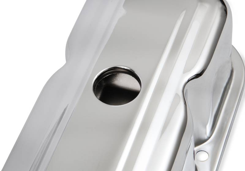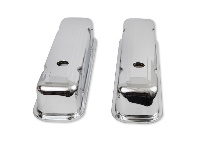 Chrome plated stamped steel valve covers have a flat smooth top, with internal baffles. Tall-style cover provides extra valve train clearance. Sold as a pair.