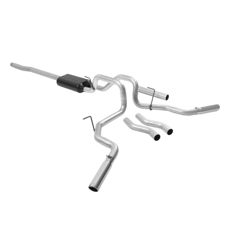 This Flowmaster Force II® Cat-back exhaust system for the 2004-2008 Ford F-150 and Lincoln Mark LT trucks with the 4.6L or 5.4L engines is perfect for the person looking for a deep aggressive exterior sound with a moderate interior tone, and with all of the performance benefits that you would expect from Flowmaster®. This bolt-on DOR/DOS (Dual Out Rear or Dual Out Side) emissions-legal exhaust system features 16-gauge mandrel-bent aluminized steel tubing flowing into a Super 50™ Series performance muffler with dual 2.50-inch aluminized steel tailpipes which use the factory hanger locations for an easy installation. The tailpipes exit either behind the rear wheels, which is ideal for towing, or straight out the back under the rear bumper for a muscular look. The system is finished off with a pair of large 3.00-inch polished stainless steel tips. The exhaust system is covered by our 3-year Limited Warranty and includes all necessary parts and hardware for an easy installation you can do at home. Note: Fits 2/4 wheel drive models all wheelbases.