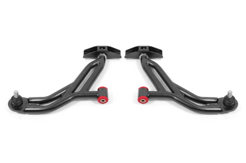 A-arms, Lower, Non-adj, Poly/Delrin Bushings, 18mm Standard Ball Joint A-arms are one of the most important, yet overlooked suspension components. They are the direct link between the front wheels and the chassis. Any deflection causes a change in alignment, which results in poor performance and driving feel. Fabricated from heavy-duty 1.25-inch, 0.120-inch wall DOM tubing, deflection is eliminated with A-arms from BMR Suspension. BMRs AA750 Lower A-arms are equipped with greasable heavy-duty ball joints, 95-durometer polyurethane bushings (front mount), and greasable Delrin bushings (rear mount) to handle the high loads. Polyurethane bushings add a solid, more responsive feel over the stock rubber bushings. BMRs bushings are internally fluted, which allows grease to evenly coat the inner sleeve. These flutes also direct grease to the outer edge of the bushing, keeping the thrust surface lubricated. This efficient lubrication ensures quiet, reliable operation over the life of the bushings. The combination of poly and Delrin bushings gives you improved steering feel and responsiveness for any for of driving. BMRs AA750 lower A-arms eliminate A-arm deflection, greatly improving steering feel and response in normal and performance driving situations. The polyurethane and Delrin bushings add strength and reduce deflection over the stock rubber bushing, while still absorbing much of the NVH. The means you get a great blend of performance and comfort. Designed for street performance, drag race, and handling, and pro-touring applications, BMR lower A-arms are engineered to give you improved geometry and increased lateral grip during cornering situations. BMR Suspension AA750 Non-Adjustable Lower A-arms are available in black hammertone and red powdercoat for long-lasting good looks. Installation time is 3-4 hours. Proudly made in the U.S.A. Control arm hardware kit RH014 (Includes upper and lower control arm hardware - Highly Recommended) also available.