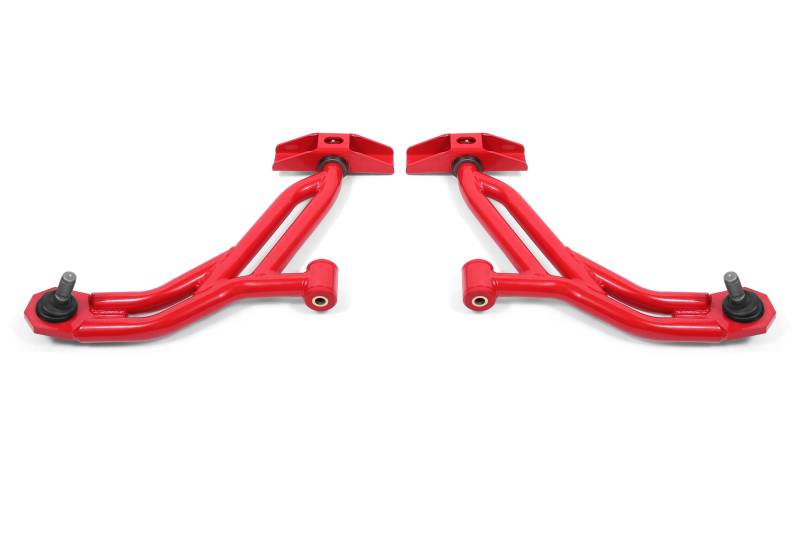 A-arms, Lower, Non-adj, Poly/Delrin Bushings, 19mm Standard Ball Joint A-arms are one of the most important, yet overlooked suspension components. They are the direct link between the front wheels and the chassis. Any deflection causes a change in alignment, which results in poor performance and driving feel. Fabricated from heavy-duty 1.25-inch, 0.120-inch wall DOM tubing, deflection is eliminated with A-arms from BMR's suspension. BMRs AA754 Lower A-arms are equipped with greasable heavy-duty ball joints, 95-durometer polyurethane bushings (front mount), and greasable Delrin bushings (rear mount) to handle the high loads. Polyurethane bushings add a solid, more responsive feel over the stock rubber bushings. BMRs bushings are internally fluted, which allows grease to evenly coat the inner sleeve. These flutes also direct grease to the outer edge of the bushing, keeping the thrust surface lubricated. This efficient lubrication ensures quiet, reliable operation over the life of the bushings. The combination of poly and Delrin bushings gives you improved steering feel and responsiveness for any type of driving.BMRs AA754 lower A-arms eliminate A-arm deflection, greatly improving steering feel and response in normal and performance driving situations. The polyurethane and Delrin bushings add strength and reduce deflection over the stock rubber bushing, while still absorbing much of the NVH. The means you get a great blend of performance and comfort. Designed for street performance, drag race, and handling, and pro-touring applications, BMR lower A-arms are engineered to give you improved geometry and increased lateral grip during cornering situations.BMR's suspension AA754 Non-Adjustable Lower A-arms are available in black hammertone and red powdercoat for long-lasting good looks. Installation time is 3-4 hours. Proudly made in the U.S.A.Control arm hardware kit RH014 (Includes upper and lower control arm hardware - Highly Recommended) also available.