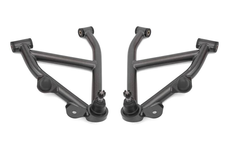 A-arms, Lower, DOM, Non-adj, Delrin Bushings, Coilover A-arms are one of the most important, yet overlooked suspension components. They are the direct link between the front wheels and the chassis. Any deflection causes a change in alignment, which results in poor performance and driving feel. Fabricated from heavy-duty 1.500-inch, 0.095-inch wall and 1.525-inch, 0.095-inch wall DOM tubing with laser-cut, CNC-formed plate steel braces for extra strength, deflection is eliminated with A-arms from BMR Suspension. BMRs AAL333 Lower A-arms are fitted with heavy-duty ball joints and greaseable, Delrin bushings add a solid, more responsive feel over the stock rubber bushings. BMRs bushings are internally fluted, which allows grease to evenly coat the inner sleeve. These flutes also direct grease to the outer edge of the bushing, keeping the thrust surface lubricated. This efficient lubrication ensures reliable operation over the life of the bushings. BMRs AAL333 Lower A-arms eliminate A-arm deflection, greatly improving steering feel and response in normal and performance driving situations. The Delrin bushings add strength and eliminate deflection compared to stock rubber bushings. The tubular design gives you tons of added strength and a significant reduction in weight over the stock arms. The means you get a great blend of performance and comfort. Designed for street performance, drag race, and road course applications. BMR Suspension AAL333 Non-Adjustable Lower A-arms are available in black hammertone and red powdercoat for long-lasting good looks. Installation time is 3-4 hours. Proudly made in the U.S.A