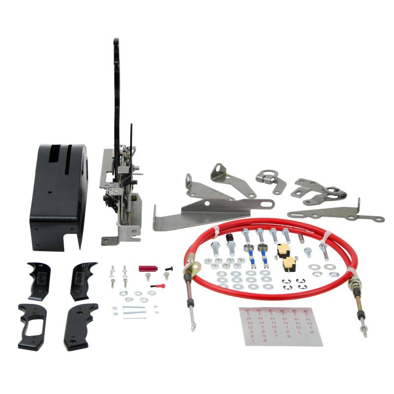 One of B&M’s easiest race shifters to drive, the Stealth Pro Ratchet self-centers after each pull so you can’t over-shift a gear, and integrates a one-hand reverse lockout meeting NHRA/IHRA rules. It includes a neutral safety switch, backup-light switch, a simulated carbon-fiber hydro-dipped aluminum cover for a high-tech look, and the tough black-anodized Magnum Grip handle with replaceable plates. A 5-ft Super-Duty cable, brackets, levers, gear indicator, and hardware are included for popular Chrysler, Ford, and GM transmissions; install kits may be required. Overall: 10.75 x 2.9 x 12 in.