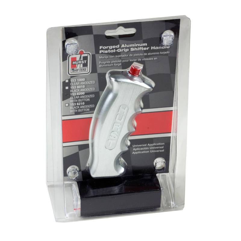CNC machined from solid billet aluminum and clear aluminum finish, the Hurst Billet/Plus Pistol Grip shift handle is designed to provide a firm comfortable natural grip when shifting, allowing less chance of your hand slipping and missing a shift. Now with snap action for instant activation, this handle is ideal for use with Hurst Roll/Control, trans brake, nitrous oxide systems or other 12 volt accessories.