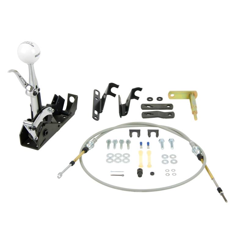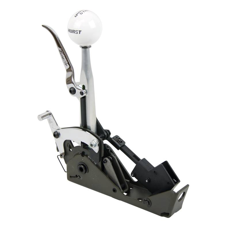 The Hurst® Quarter Stick®2 has all the same race proven features of the original Quarter Stick, but this model has a rear exit cable location which is ideally suited for rear engine dragsters. Its compact size fits easily in race cars with limited space and is very lightweight at only 2.5 pounds. Features include black oxide coated steel construction, 1018 hardened steel gate plate, forged aluminum shift stick with 7/16-20 tpi and a classic white Hurst shift knob. Other features include factory installed neutral safety switch, chrome-plated trigger, and a spring-loaded reverse Loc/Out mechanism that complies with NHRA/IHRA safety rules. Includes all necessary hardware, a 5-foot long shifter cable, and complete installation instructions. Note: Optional aluminum mounting bracket, backup light switch and lightweight aluminum or plastic shifter covers available separately. Does not fit early GM cast iron PG transmission.