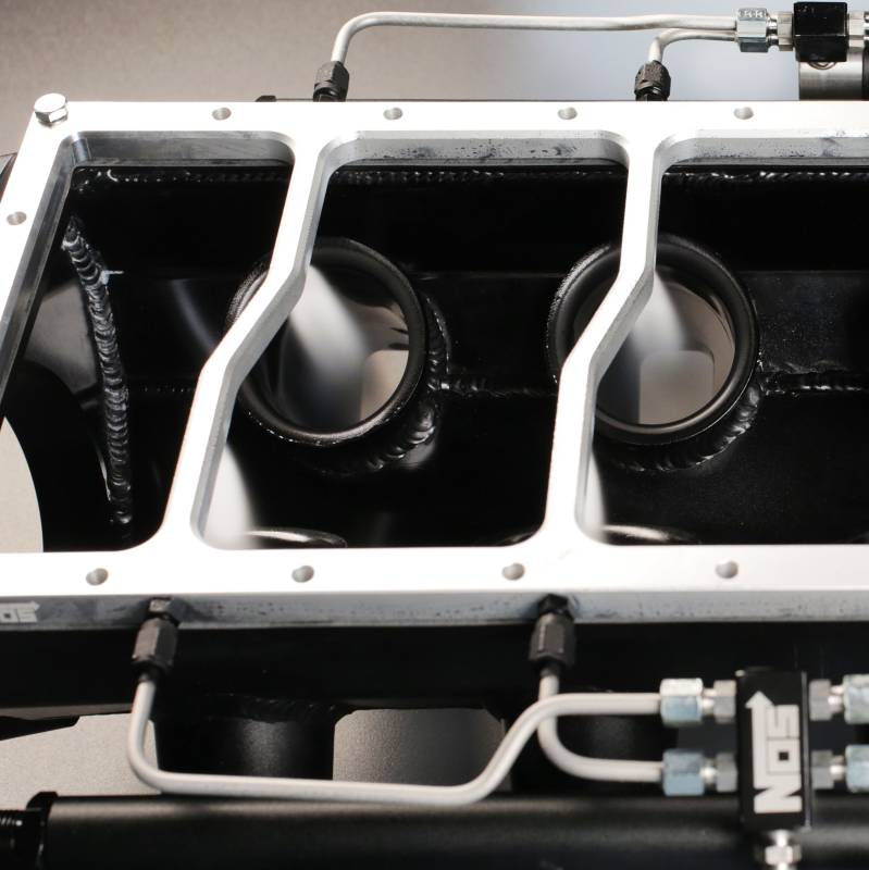 This NOS plate designed to bolt between the upper and lower intake manifold on Sniper EFI Fabricated Race Series LS manifolds. This sandwich-style plate gives you an easy way to add nitrous oxide to your Sniper EFI Race Intake equipped LS engine. Our plate is machined from billet 6061-T6 aluminum, laser engraved with NOS logo, then anodized for great looks and excellent corrosion protection.\n\nOur 1-piece plate features machined passages that precisely spray into the center of each cylinder. Plate includes jetting for up to 250 horsepower but is capable of supporting 1000+ horsepower. The plate is made from billet aluminum with passages machined directly into the plate so there is no need to worry about spray bars breaking or spinning. Includes NOS plate, gasket, jet holders, and jets.