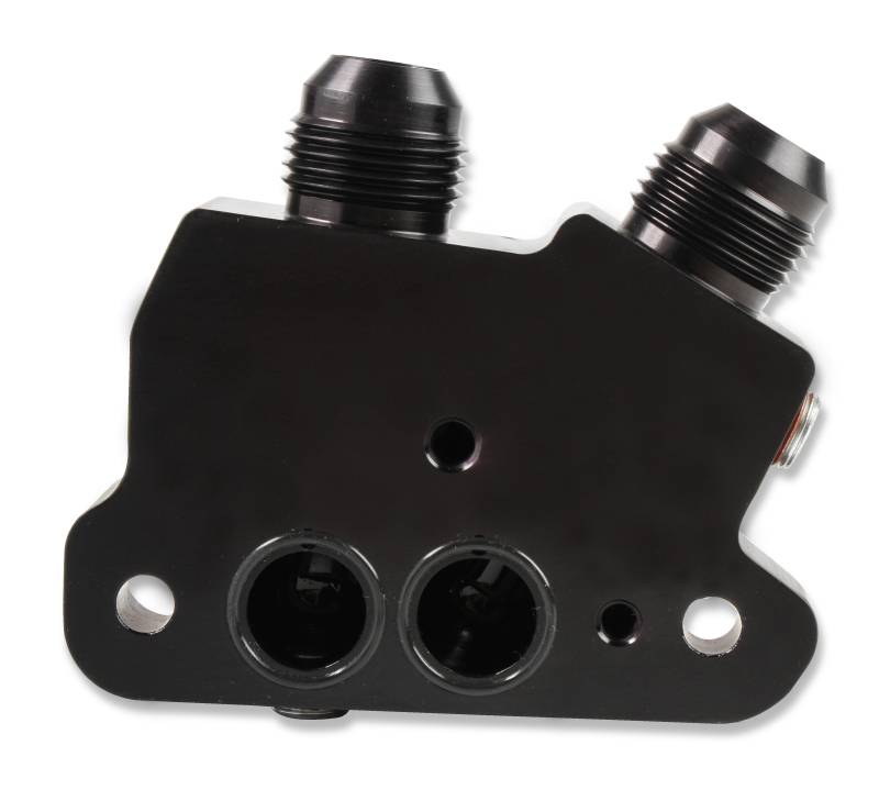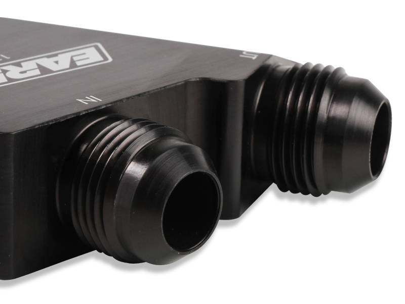 Earl's billet side mount oil cooler adapters are the slick way to add an oil cooler to your GM LS or Gen-V LT engine. The slim design of these adapters clear most headers and other components and feature -10 AN male connections. These adapters are black anodized and use O-Ring seals for a leak-free installation.
