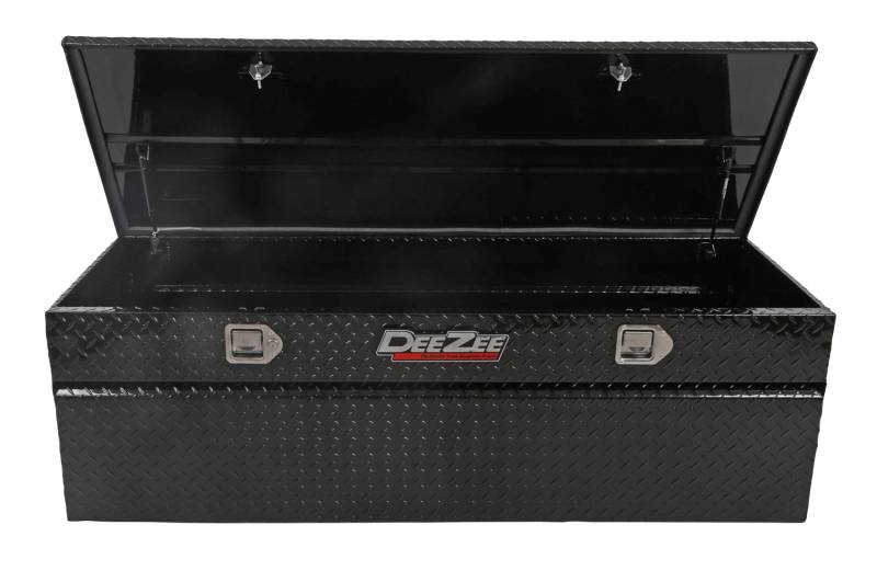 Red Label Utility Chest Dee Zee Tool Box - Red Label Chest. Constructed of heavy duty Brite-Tread aluminum. Black-Tread powder coat, provides a gloss black finish while it protects and prevents oxidation. Crown style lid with a full pan double-V stiffener for superior rigidity. Extra wide design for maximum storage space. Other features: lockable stainless steel paddle handles, dampened gas shocks, closed cell foam gasket, and self-adjusting strikers. Heavy Duty Brite-Tread Aluminum Black-Tread Powder Coat Gloss Black Finish Crown Style Lid For Superior Rigidity Lockable Stainless Steel Paddle Handles
