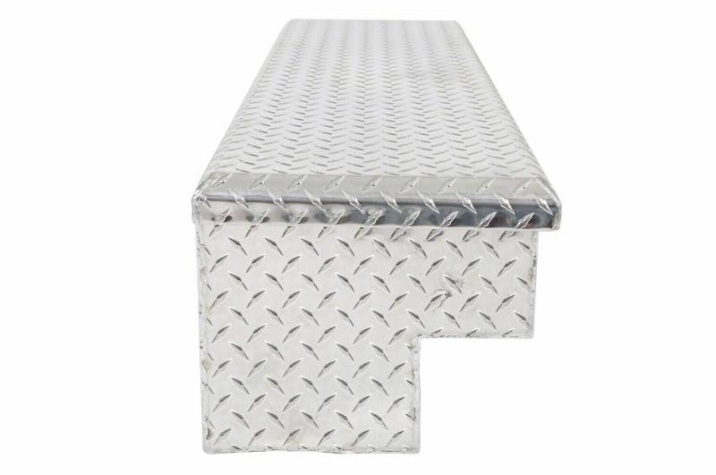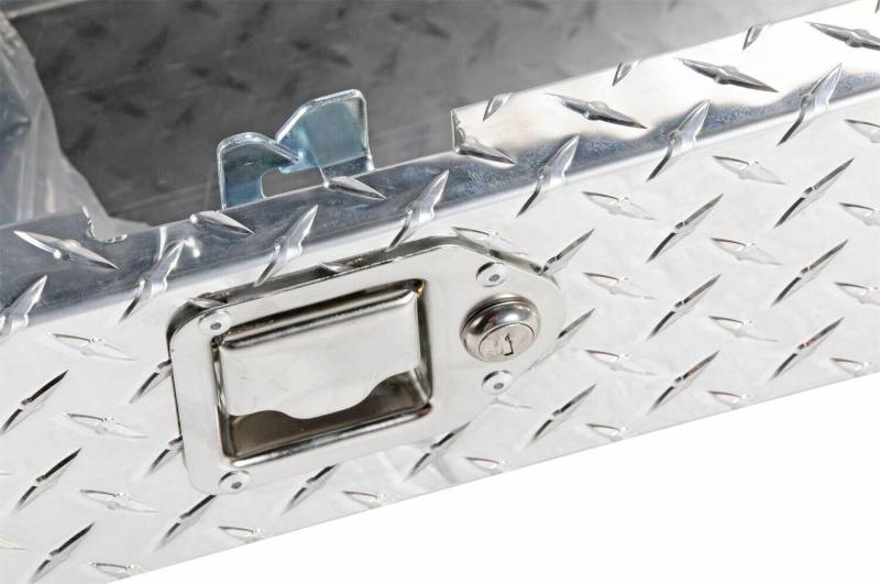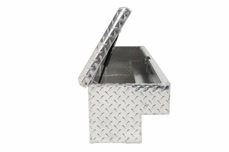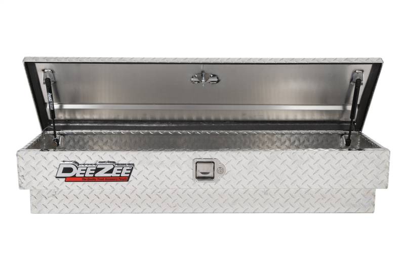 Dee Zee Tool Box - Red Label Side Mount Boxes. Constructed of heavy duty Brite-Tread aluminum. Crown style lid for superior rigidity. Other features: lockable stainless steel paddle handles, dampened gas shocks, closed cell foam gasket, and self-adjusting strikers. Great storage by themselves or matched with our crossover Tool Boxes.