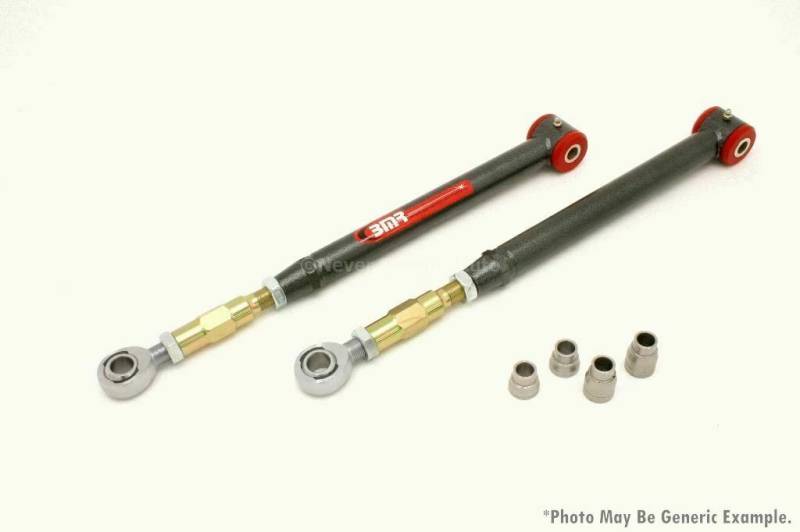Stock control arms are marginal at best. Bushing deflection combined with control arm flex creates erratic handling and inconsistent rear end stability when subjected to the added loads of performance driving. BMR control arms are TIG welded and utilize a combination of one polyurethane end and one bearing end (rod end). The polyurethane end is a greaseable 90 durometer spiral fluted bushing and the bearing is QA1's XM series rod end. Our CNC machined adjusters are made from 4130 chromoly and have rolled threads. All rod end spacers are 304 stainless. You won't find better quality components. Additiionally, our control arms retain the factory designed rear offset, a necessity others overlook resulting in split, binding bushings.