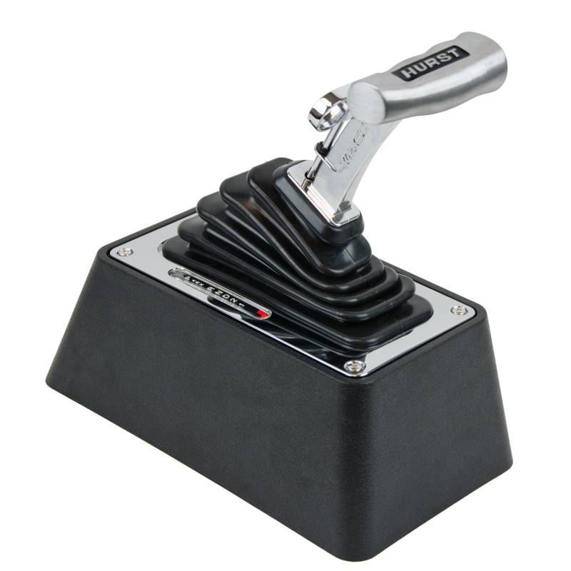 The Hurst® V-Matic®3 shifter is a front exit cable ratchet shifter designed for most popular 3 & 4-speed automatic transmissions and features a park and reverse lockout trigger actuating system, that has a smooth and flawless ratcheting action that only allows you to shift one gear at a time. No more missed shifts. The universal base design allows for floor mount and can be trimmed to custom fit the contour of the floor and includes an accordion-style shift boot and lighted gear indicator. The forward exit cable is designed for a quick and easy installation for smooth accurate shifts and the reverse lockout trigger function meets NHRA/IHRA safety requirements. The shifter also includes a neutral safety switch, backup light switch, and brushed aluminum Hurst T-handle. Notes: AOD transmissions will require B&M install kit 40496. GM 4L60E through 4L80E transmissions will require Hurst install kit 1175498. Overall Dimensions - 12.62L x 5.6W x 11.65H