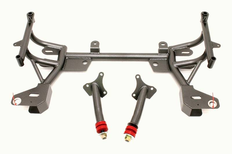 K-member, TURBO, SBC,BBC Motor Mounts, Standard Rack Mounts Reduce weight, increase frontend rigidity, and swap a Small-Block or Big-Block Chevy engine into your F-body with a Tubular K-members from BMR Suspension. BMR Tubular K-Members are designed to provide a lightweight alternative to the heavy and bulky factory K-member. Manufactured from 1-5/8-inch x 0.120 wall and 1-1/4-inch x 0.095 wall DOM tubing, BMRs K-members give you a lightweight, extremely strong K-member. Every BMR K-member is 100-percent bolt-in and requires no modifications for fitment. The K-members are built with provision for either factory or manual steering racks. Designed for street performance, drag race, and road race applications, BMR Tubular K-members drop weight and add loads of structural rigidity. BMRs unique K-member design features integrated frame stands that replace the factory cast iron frame stands. This additional weight reduction allows us to use larger diameter tubing and thicker mounting plates for additional strength over other companies K-members. When combined with BMRs upper and lower A-arms, a minimum weight reduction of 42 pounds is common. With other lightweight frontend parts, weight reduction of up to 100 pounds is easily achievable. The K-member also comes with specially designed engine mounts allowing you to easily swap a SBC or BBC engine into your Fourth Gen F-body with no fabrication. BMR Suspensions KM015 Tubular K-Member is available in black hammertone and red powdercoat for long-lasting good looks. Installation time is about 4-5 hours. Proudly made in the U.S.A.!
