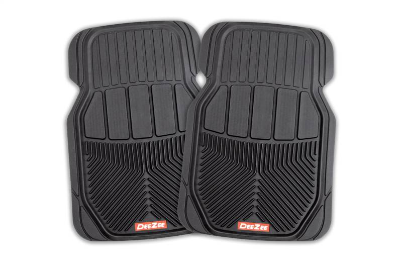 All Weather Floor Mats Dee Zee Floor Mats - Protects the interior of your vehicle. Constructed of thick, tough, and durable OEM-style rubber. Deep groves hold water, mud, and snow - keeping it away from your vehicles interior. Raised pattern to increase traction. Rubber cleats on bottom keep mat in position. Sold in pairs. Universal fit - trim-able design to fit nearly any vehicle. Thick OEM Quality Rubber Deep Grooves Keep Dirt Off Your Carpet Stylish Dee Zee Logo Cleated Back Prevents Slipping Fits Most Vehicles
