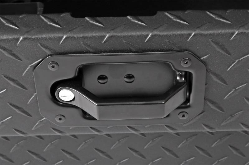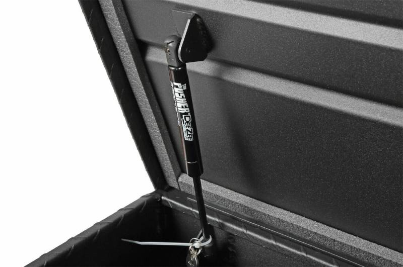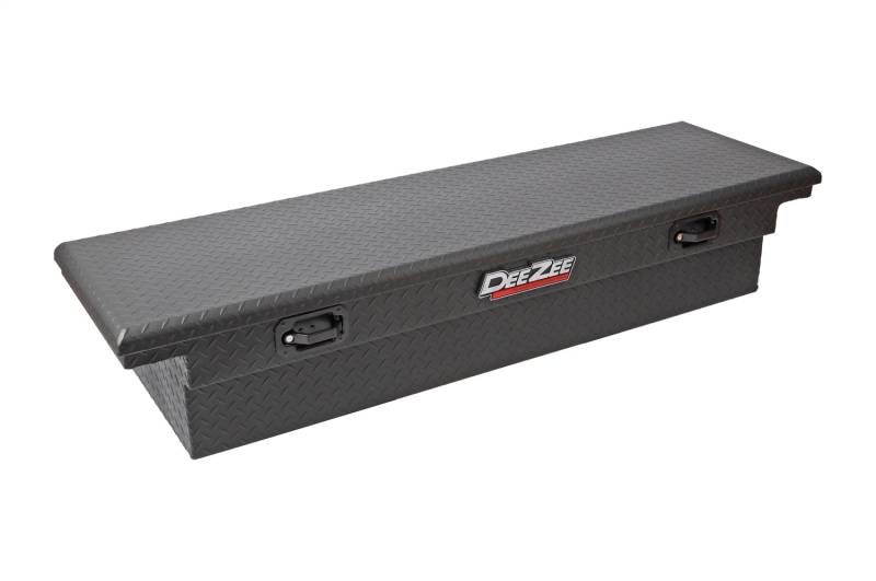 Dee Zee Tool Box - Red Label Single Lid Crossover. Constructed of heavy duty Brite-Tread aluminum with low profile design. Texture black powder coat, provides a matte black finish while it protects and prevents oxidation. Crown style lid with a full pan double-V stiffener for superior rigidity. Other features: lockable powder coated black pull handles, dampened gas shocks, closed cell foam gasket, and self-adjusting strikers. Removable plastic tool tray to help keep small items organized.