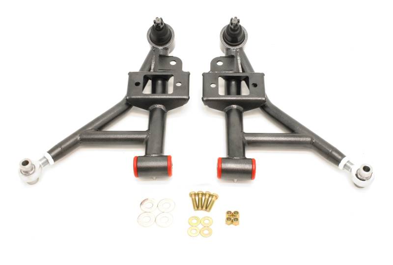 A-arms, Lower, DOM, Adjustable, Polyurethane/Rod End Combo, 1" Lowering A-arms are one of the most important, yet overlooked suspension components. They are the direct link between the front wheels and the chassis. Any deflection causes a change in alignment, which results in poor performance and driving feel. Fabricated from heavy-duty 1.25-inch, 0.095-inch wall DOM tubing and 1 5/8-inch, 0.120-inch wall tubing with laser-cut, CNC-formed plate steel plate, deflection is eliminated with A-arms from BMR's suspension. BMRs AA020 Lower A-arms are equipped with greasable heavy-duty ball joints, zinc-plated, X-series, heat-treated, chrome-moly, self-lubricating, Teflon-lined rod ends and greasable, 95-durometer polyurethane bushings. Polyurethane bushings add a solid, more responsive feel over the stock rubber bushings. BMRs bushings are internally fluted, which allows grease to evenly coat the inner sleeve. These flutes also direct grease to the outer edge of the bushing, keeping the thrust surface lubricated. This efficient lubrication ensures quiet, reliable operation over the life of the bushings. The combination of rod ends and bushings gives you improved steering feel and responsiveness, with all the adjustability needed for any for of driving.