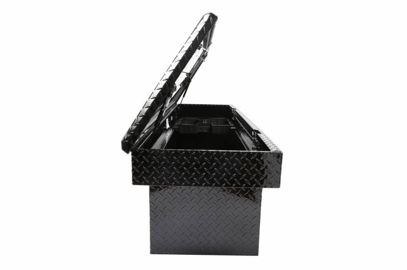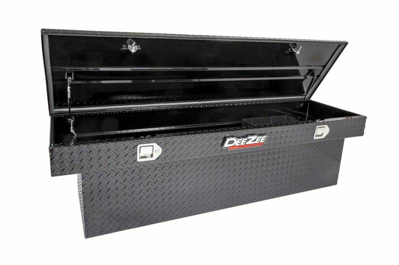 Dee Zee Tool Box - Red Label Single Lid Crossover. Constructed of heavy duty Brite-Tread aluminum with extra deep design for extra storage space. Black-Tread powder coat, provides a gloss black finish while it protects and prevents oxidation. Crown style lid with a full pan double-V stiffener for superior rigidity. Other features: lockable stainless steel paddle handles, dampened gas shocks, closed cell foam gasket, and self-adjusting strikers. Removable plastic tool tray to help keep small items organized.