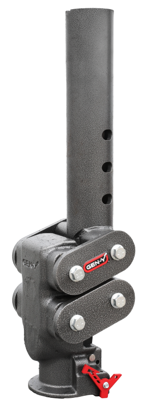 Manual Latch 2.5" Offset 4" Square Tube Gooseneck 2 5/16" Coupler All GEN-Y products are rigorously tested and exceed the SAE J2638 testing requirements. Never exceed recommended capacity on any trailer tow coupling or vehicle receiver hitch. Tow capacity is limited by the lowest-rated component. Average break-in period for hitch is 1,000 miles. When applicable, use a 3/4 pin. CHECK YOUR HOLE PATTERN BEFORE PURCHASE – gooseneck trailers vary significantly from brand to brand, a custom hole pattern may be required for your trailer. Built-In Suspension Creates Up to 90% Smoother Ride Shock Absorption Protects Cargo from Harsh Bumps Break-In Period: 1,000 miles All GEN-Y products are rigorously tested and exceed the SAE-J684 Weight testing requirements