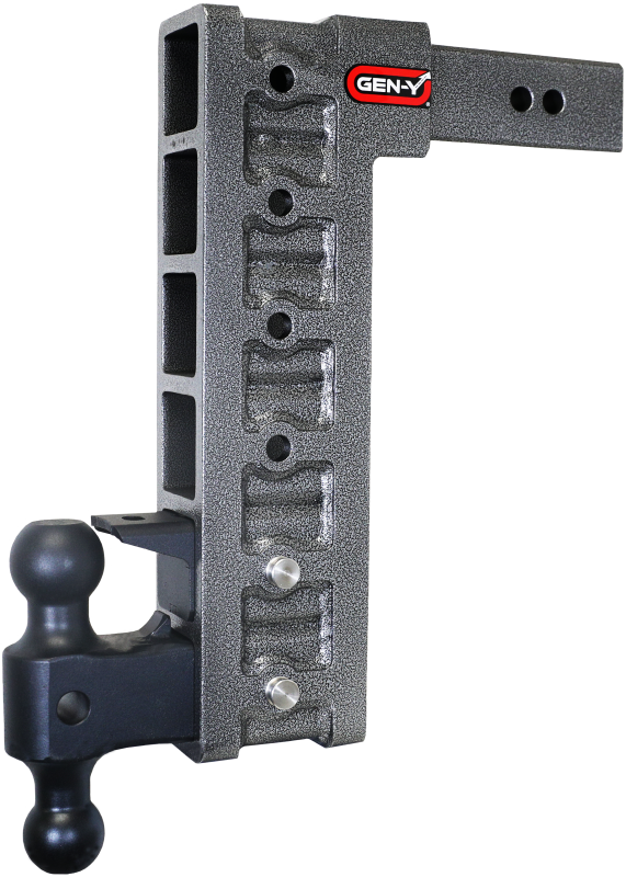 MEGA-DUTY Drop Hitch GEN-Y's Mega-Duty Adjustable Drop Hitches start at 10,000 LB towing capacity and go up to 32,000 LB towing capacity. There are multiple drop options as well depending on your trailer towing needs. Fully Adjustable Dual-Ball, Pintle Lock, & Stab Kit 3K Tongue Weight 21K Towing Capacity
