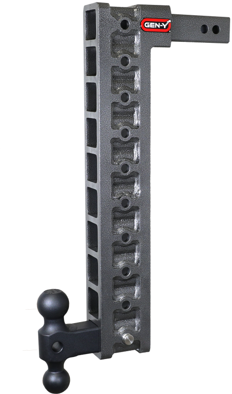 MEGA-DUTY Drop Hitch GEN-Y's Mega-Duty Adjustable Drop Hitches start at 10,000 LB towing capacity and go up to 32,000 LB towing capacity. There are multiple drop options as well depending on your trailer towing needs. Adjustable Dual-Ball & Stab Kit 1.5K Tongue Weight 10K Towing Capacity