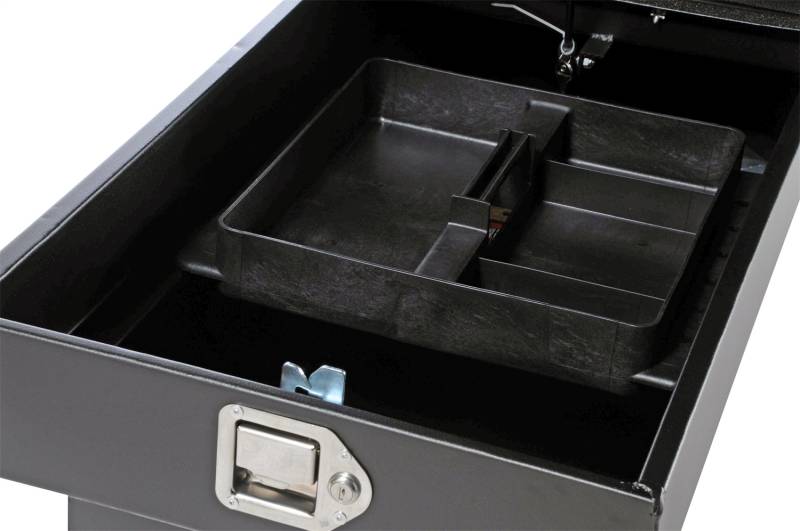 Dee Zee Tool Box - Hardware Series Double Lid (Gull Wing) Crossover. Constructed of durable 20-gauge steel. Protected by texture black NRT(TM) (No Rust Technology) rust inhibitor powder coat finish. Crown style lid with a full pan double-V stiffener for superior rigidity. Other features: lockable stainless steel paddle handles, dampened gas shocks, closed cell foam gasket, and self-adjusting strikers. Removable plastic tool tray to help keep small items organized.