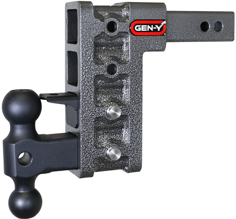 MEGA-DUTY Drop Hitch GEN-Y's Mega-Duty Adjustable Drop Hitches start at 10,000 LB towing capacity and go up to 32,000 LB towing capacity. There are multiple drop options as well depending on your trailer towing needs. Adjustable Dual-Ball & Pintle Lock 1.5K Tongue Weight 10K Towing Capacity