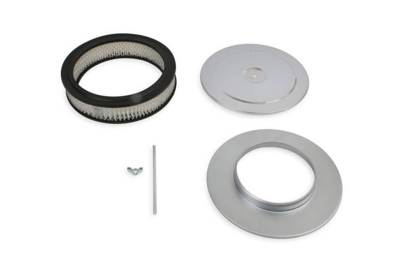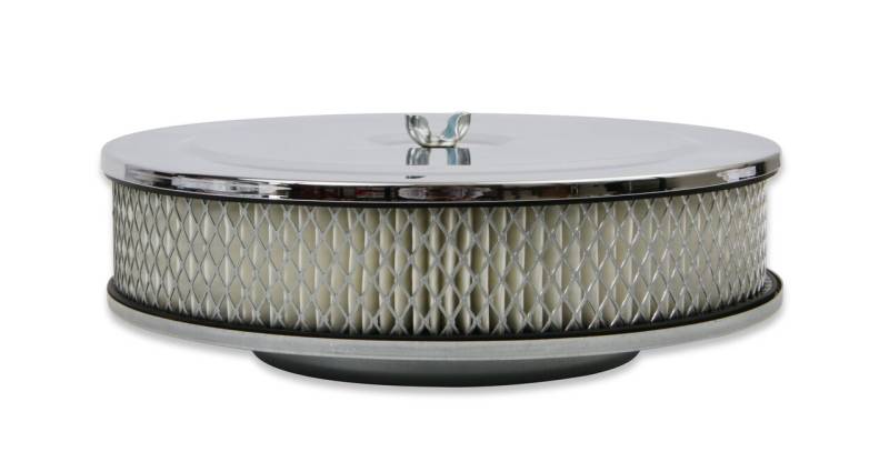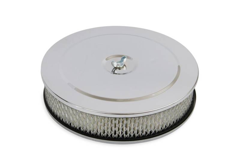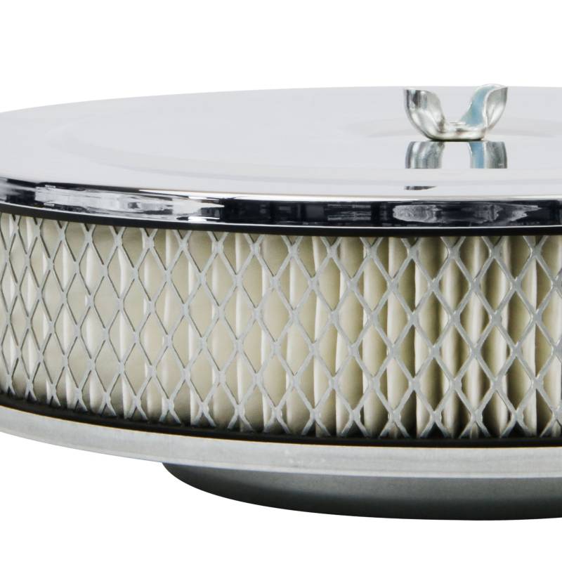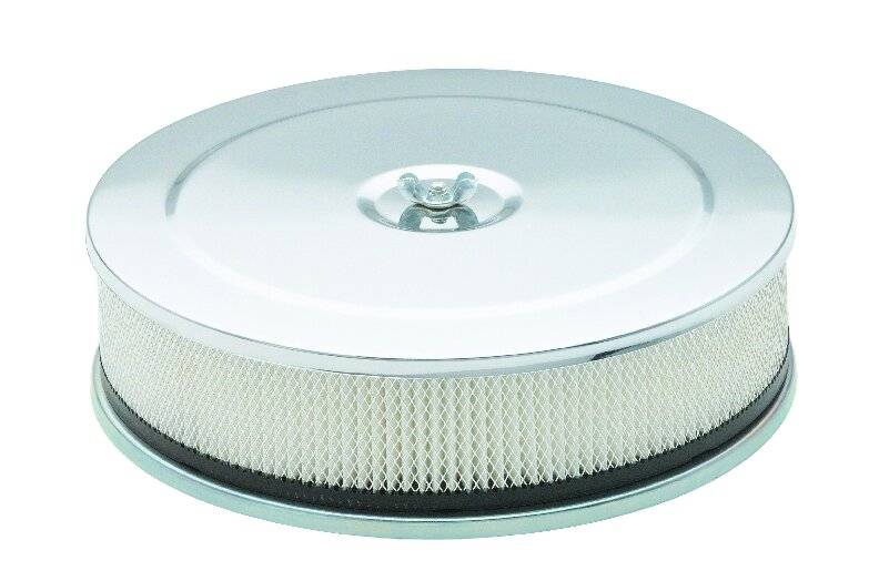 This Mr. Gasket Air Cleaner has chrome plated steel top and base. Has a high CFM replaceable flame retardant paper element. Also includes carburetor air cleaner stud and wing nut. Fits most 2,3 and 4-barrel carburetors with a 5-1/8 inch neck.