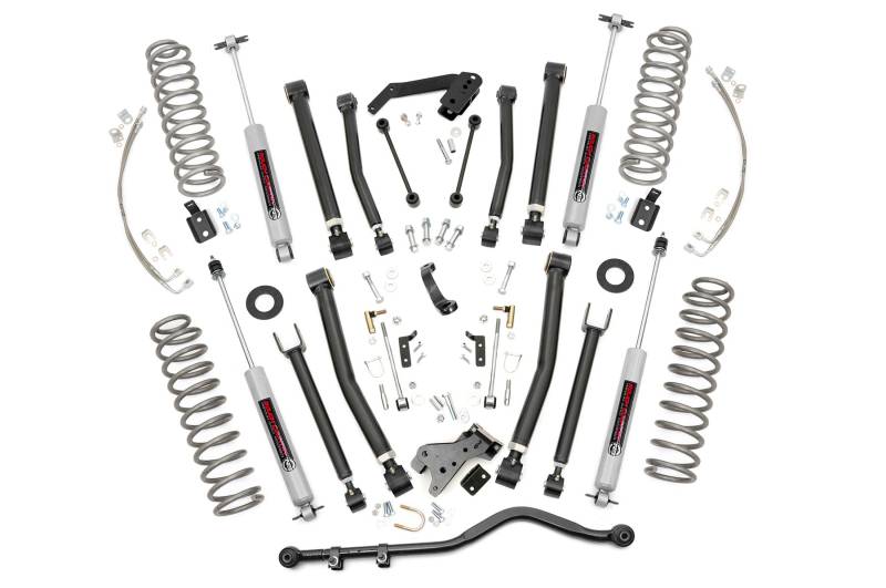 Total Transformation for Your Jeep: Elevate your ride with Rough Country's 6in X-Series Suspension Lift, a complete kit designed to deliver aggressive style and unbeatable off-road performance.Precision Suspension Tuning: This all-inclusive kit features front and rear upper and lower adjustable control arms with a high-clearance design, allowing you to dial in the perfect ride height and suspension setup. Lifted coil springs paired with coil correction plates optimize spring angles for superior vibration dampening on any terrain.Unmatched Strength and Adjustability: For the toughest trails, the forged solid steel adjustable track bar provides exceptional durability and axle centering. Weighing 16 pounds, this heavy-duty component installs easily and adjusts on-vehicle for precise alignment.Customizable Shock Performance: Comes standard with Rough Country's N3 Series shocks, featuring 10-stage variable valving and a high-pressure nitrogen charge for smooth highway comfort and excellent off-road control. For drivers seeking maximum performance, upgrade to premium M1R monotube shocks with faster heat dissipation, enhanced damping, and superior off-road handling.