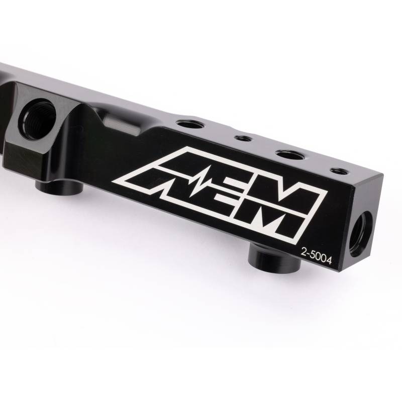 AEM High Volume fuel rails feature a 1/2-inch fuel bore to support fuel flow for applications up to 1,000 horsepower. This large bore also dampens backpressure pulses created by larger injectors and works perfectly with stock injector sizes. An additional 1/8th NPT port is included to accommodate a nitrous set up or fuel pressure gauge. A custom fuel line fitting is included for the factory fuel line, and in most cases the ends of each rail are pre tapped to accept -6 AN or 9/16"x18 fittings for users who want to use custom fuel lines.