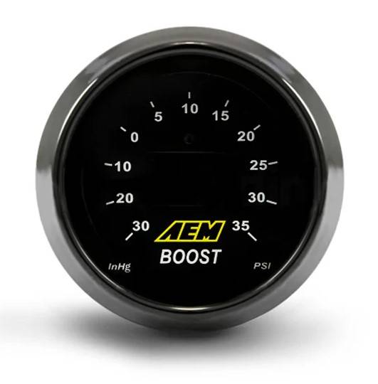 AEM's Digital Boost Display Gauges combine unsurpassed accuracy, speed and control with an easy-to-read digital LED interface that displays boost in 1 PSI increments, and a sweeping LED "needle" that lines the edge and moves as boost from 0 to up to 50 PSI. The boost gauge's digital readout will automatically increase and decrease in intensity due to the built in ambient light sensing photocell.AEM's digital boost gauges include a 0-5v analog output for use with data loggers and virtually any engine management system, such as the Infinity ECU, Series 2 EMS or AQ-1 Data Logger, making it the perfect solution for users who need to monitor and data log boost at high RPM on tuned engines. Each gauge includes interchangeable silver and black bezels and black and white faceplates to personalize the look of your gauge.