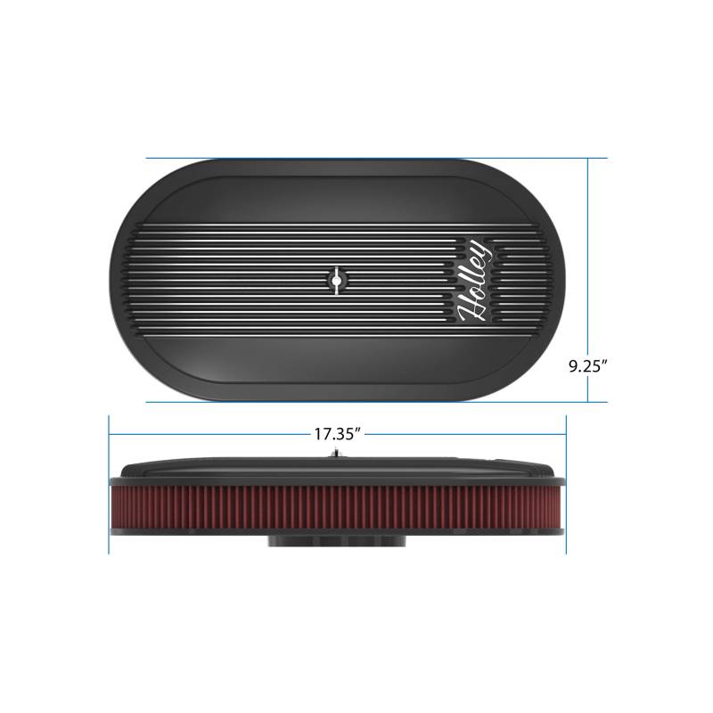 The oversized air cleaner look was king in the muscle car era, and we wanted to take engine bay styling back to that nostalgic time with these Holley Vintage Series Oval Air Cleaner assemblies. Each air cleaner assembly includes a durable cast aluminum Vintage Series finned lid, a stamped steel 1/2" raised baseplate, a 2.5" tall premium washable and reusable filter element, and all hardware needed for easy installation.\nThese oversized oval air cleaner assemblies dwarf the competition with their size - measuring at 17" long x 9" wide - which will make your engine bay stand out in a crowd of stale old oval air cleaners. The included stamped steel baseplate is designed to fit'single 4-barrel carburetors with a standard 5-1/8" diameter neck, and the 1/2" raise is enough to clear throttle linkages, carburetor bowls, and distributors without any worry of interference. These oval air cleaners are available in 5 unique finish options to perfectly match most Holley Vintage Series valve covers, and paired together, their styling creates an unsurpassed vintage vibe.