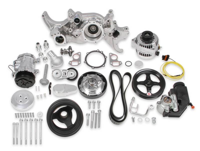 Holley's Mid-Mount complete accessory system has all accessories pulled in tighter than other accessory drives. At the heart of the system is a "bracketless" design, where the accessories bolt directly to the water pump for a clean, integrated form. The design offers superb engine visibility to show off your horsepower, not your accessories. Among the many swap friendly features are bottom heater outlets for clearance in tight applications. The Holley designed alternator is just as innovative. This premium alternator utilizes 6-phase technology as found on the C7 Corvette. The water pump also shares its design efficiencies with that of the C7 Corvette. The compact and reliable SD7 A/C compressor and Type II P/S pump with baffled reservoir are also integrated.\nThe Mid-Mount drive completes Holley's trilogy of accessory solutions giving a third option compared to the High and Low-Mount previously released. All three accessory solutions are for LS engines.\nWhen we say "complete", we mean complete. The Mid-Mount system comes with everything you need. All accessories are included; the water pump, A/C compressor, Alternator, P/S pump with reservoir, and the crank damper. All pulleys and the belt are supplied. Even heater hose adapters, power steering to -6 AN hardline, and the alternator plug/harness are included. Easy assembly was a priority during the entire development of this accessory solution. Color graphical instructions walk you through every step of the ultra-easy installation.\nPatent - www.holley.com/patents/
