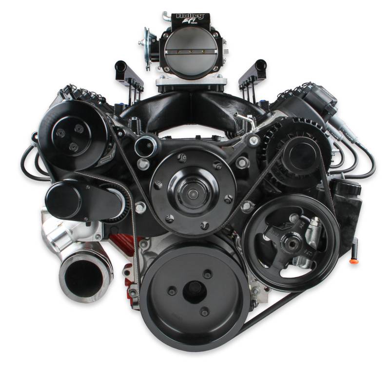 Holley's Mid-Mount complete accessory system has all accessories pulled in tighter than other accessory drives. At the heart of the system is a "bracketless" design, where the accessories bolt directly to the water pump for a clean, integrated form. The design offers superb engine visibility to show off your horsepower, not your accessories. Among the many swap friendly features are bottom heater outlets for clearance in tight applications. The Holley designed alternator is just as innovative. This premium alternator utilizes 6-phase technology as found on the C7 Corvette. The water pump also shares its design efficiencies with that of the C7 Corvette. The compact and reliable SD7 A/C\ncompressor and Type II P/S pump with baffled reservoir are also integrated.\nWhen we say "complete", we mean complete. The Mid-mount system comes with everything you need. All accessories are included; the water pump, A/C compressor, Alternator, P/S pump with reservoir, and an SFI certified damper w/hard anodized billet crank pulley. All pulleys and the belt are supplied. Even heater hose adapters, power steering to -6 AN hardline, and the alternator plug/harness are included. Easy assembly was a priority during the entire development of this accessory solution. Color graphical instructions walk you through every step of the ultra-easy installation.\nThis Premium Mid-Mount system comes with dress up pulley covers and an SFI certified damper. Partnered with this damper is a billet 6061-T6 aluminum hard anodized crank pulley. This system is ready for the racetrack if you want to play or just be ready for anything on the street.\nPatent - www.holley.com/patents/