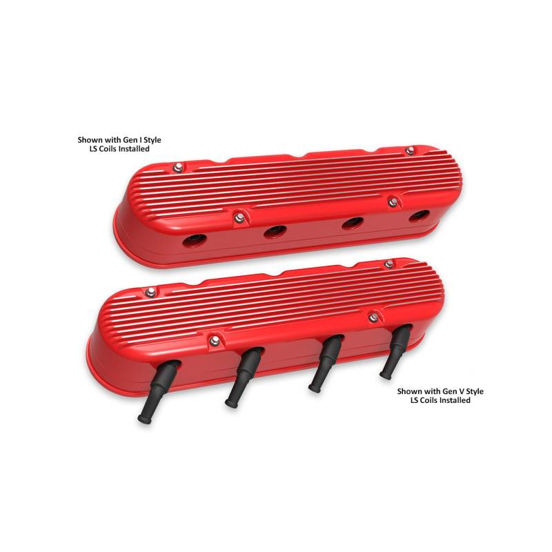 Holley's new 2-Piece LS valve covers are a great way to update the look of your LS engine without the use of complicated adapter systems or the hassle of remote coil relocation. These modular LS valve covers feature an OE height, internally baffled LS valve cover base with integrated coil mounts for popular Gen I and Gen V style LS coil bodies (coils not included), and a vintage style finned overcover that hides the unsightly LS coils and messy wiring harness - allowing the full performance benefits of coil-on-cover ignition setups without the robotic styling. Each modular coil cover features a simplified version of our Vintage Series style fins that seamlessly blends with other finned Holley dress-up accessories such as our LS valley covers and 14" round air cleaners. The coil cover also features cast-in provisions for the spark plug boots and coil wiring harness so no extensions or custom wiring is required.\nEach 2-Piece LS valve cover set includes a low-profile billet oil fill cap, hardware and spacers for mounting both versions of LS coil bodies, and 12-point dress up hardware and rubber grommets for the coil covers. These modular LS valve covers will be offered in 5 unique finishes: natural cast, polished, satin black, factory orange, and gloss red (black, factory orange and gloss red sets feature machined fins). Polished and black versions coming soon.