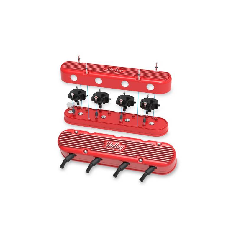Holley's new 2-Piece LS valve covers are a great way to update the look of your LS engine without the use of complicated adapter systems or the hassle of remote coil relocation. These modular LS valve covers feature an OE height, internally baffled LS valve cover base with integrated coil mounts for popular Gen I and Gen V style LS coil bodies (coils not included), and a vintage finned overcover that hides the unsightly LS coils and messy wiring harness - allowing the full performance benefits of coil-on-cover ignition setups without the robotic styling. Each modular coil cover features our Vintage Series style fins with a script Holley logo that seamlessly blends with other finned Holley dress-up accessories such as our LS valley covers and 14" round air cleaners. The coil cover also features cast-in provisions for the spark plug boots and coil wiring harness so no extensions or custom wiring is required.\nEach 2-Piece LS valve cover set includes a low-profile billet oil fill cap, hardware and spacers for mounting both versions of LS coil bodies, and 12-point dress up hardware and grommets for the coil covers. These modular LS valve covers are available in 5 unique finishes: natural cast, polished, satin black, factory orange, and gloss red (black, factory orange and gloss red sets feature machined fins and logo details).