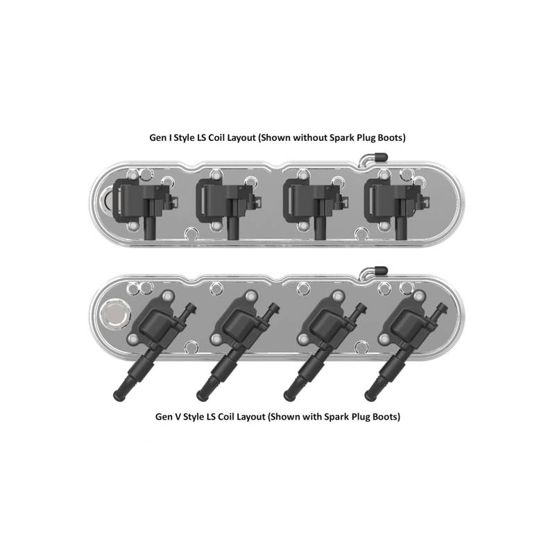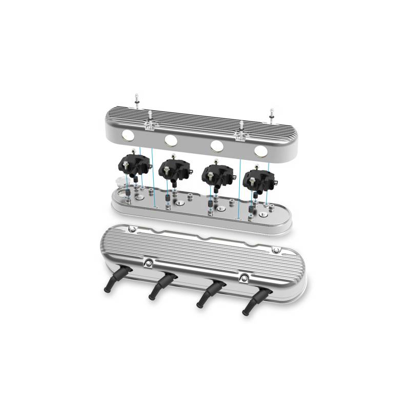 Holley's new 2-Piece LS valve covers are a great way to update the look of your LS engine without the use of complicated adapter systems or the hassle of remote coil relocation. These modular LS valve covers feature an OE height, internally baffled LS valve cover base with integrated coil mounts for popular Gen I and Gen V style LS coil bodies (coils not included), and a vintage style finned overcover that hides the unsightly LS coils and messy wiring harness - allowing the full performance benefits of coil-on-cover ignition setups without the robotic styling. Each modular coil cover features a simplified version of our Vintage Series style fins that seamlessly blends with other finned Holley dress-up accessories such as our LS valley covers and 14" round air cleaners. The coil cover also features cast-in provisions for the spark plug boots and coil wiring harness so no extensions or custom wiring is required.\nEach 2-Piece LS valve cover set includes a low-profile billet oil fill cap, hardware and spacers for mounting both versions of LS coil bodies, and 12-point dress up hardware and rubber grommets for the coil covers. These modular LS valve covers are available in 5 unique finishes: natural cast, polished, satin black, factory orange, and gloss red (black, factory orange and gloss red sets feature machined fins).